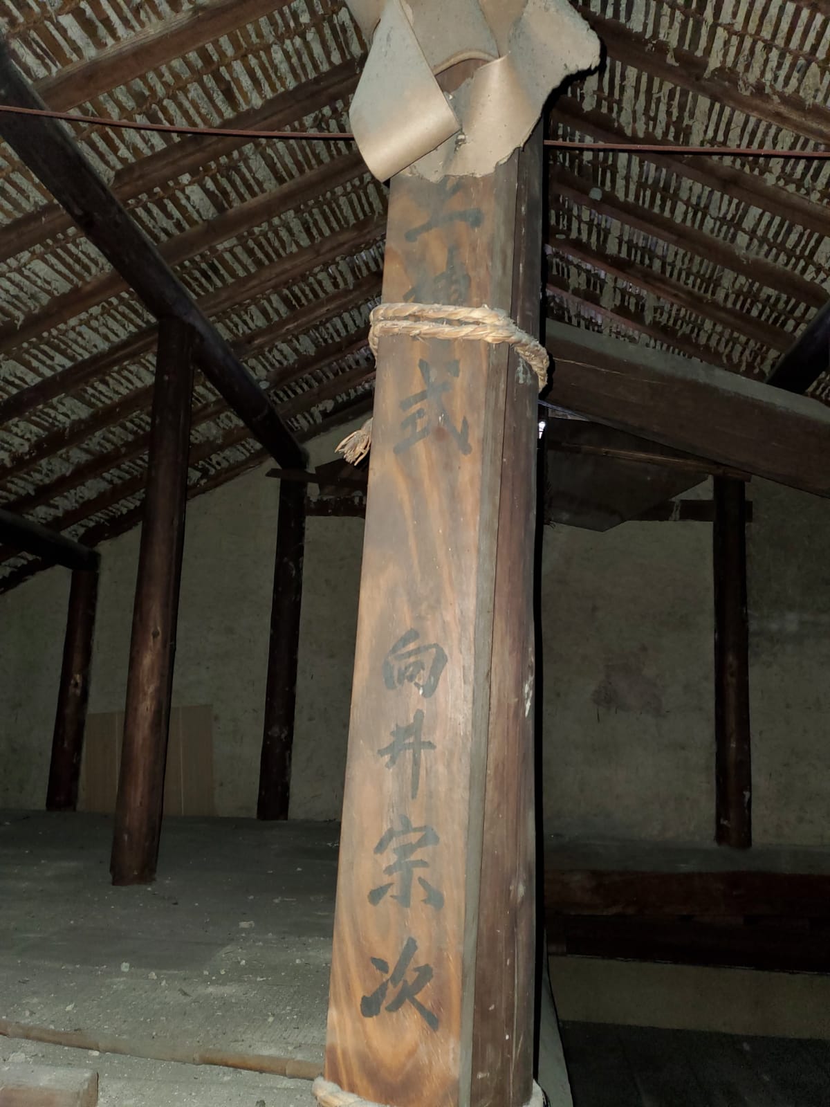 Deze paal trof Yutaka aan op zijn inspectie door het huis met zijn zwager Yuji-san (2 mei 2021).Het blijkt de eerste paal te zijn die geslagen is en er blijkt een inwijdingsceremonie te zijn geweest op de dag dat het huis gebouwd werd.
